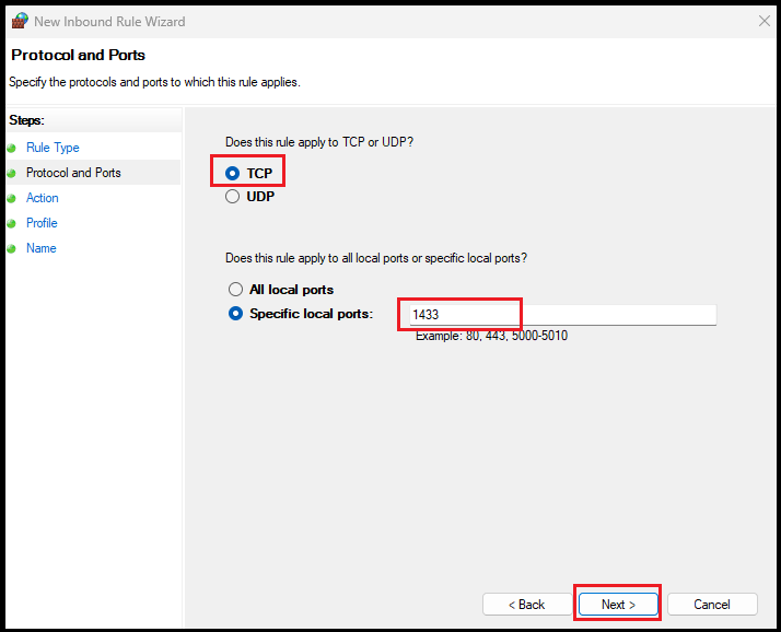 4). Select TCP and enter 1433 in the Specific Local Ports field, then click Next.