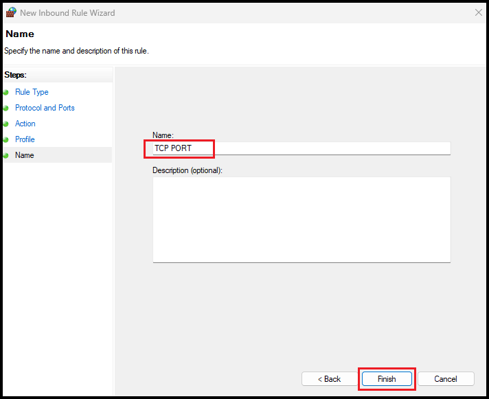 7). Name the rule TCP PORT, then click Finish.
