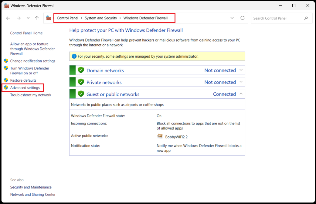 1). Open Firewall Advanced Settings by navigating to Control Panel > System and Security > Windows Defender Firewall > Advance Settings.