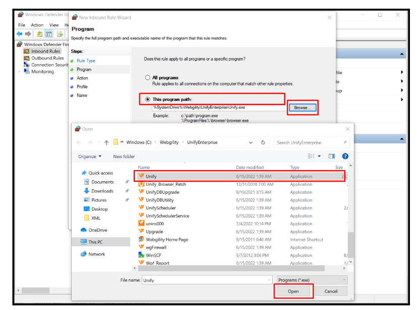 Adding Unify.exe to Inbound Rules