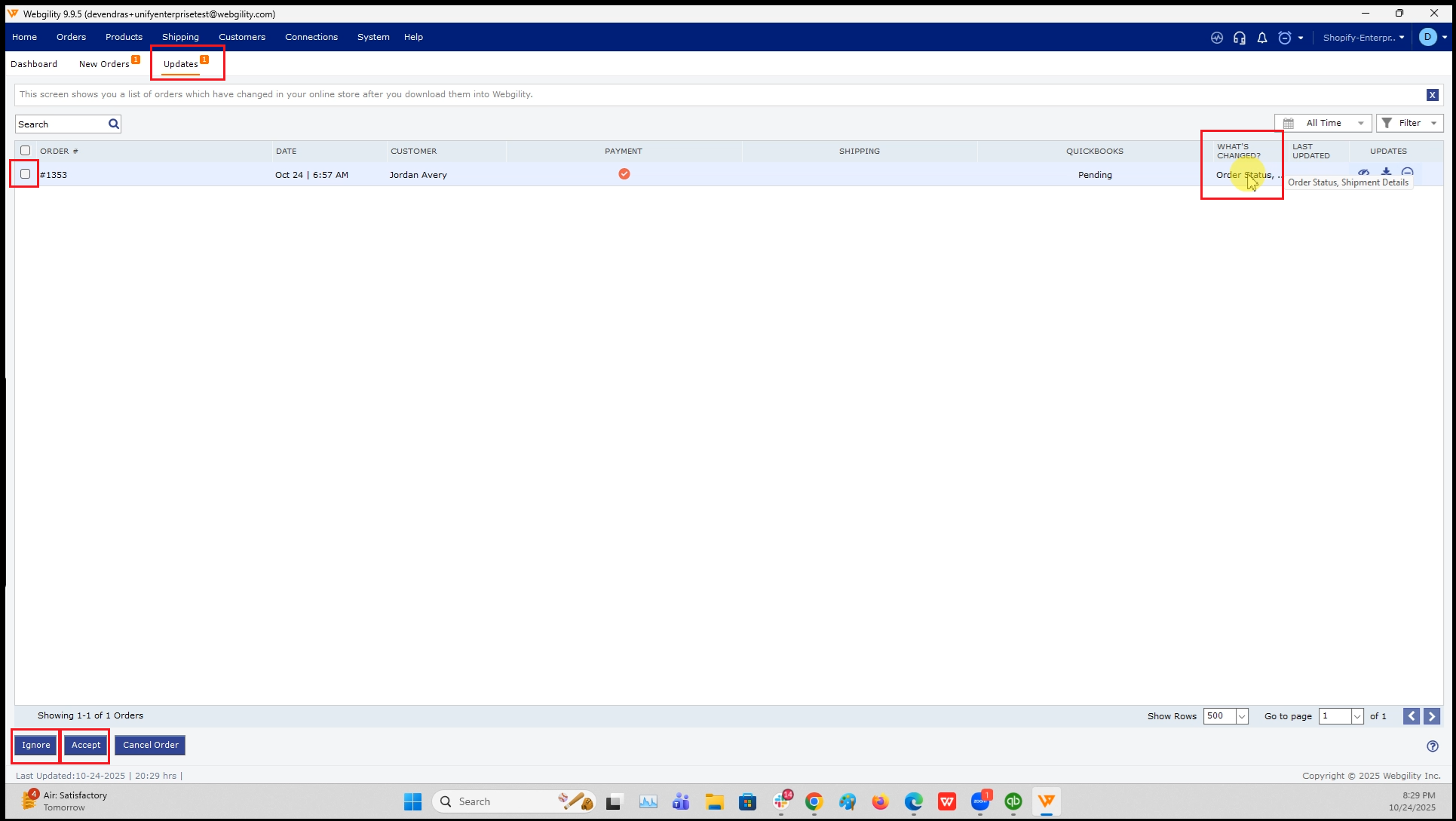 The Updates View contains a list of all the orders that have updates based on the configurations you have set up. Downloading order updates is not a common practice and requires special use cases.
