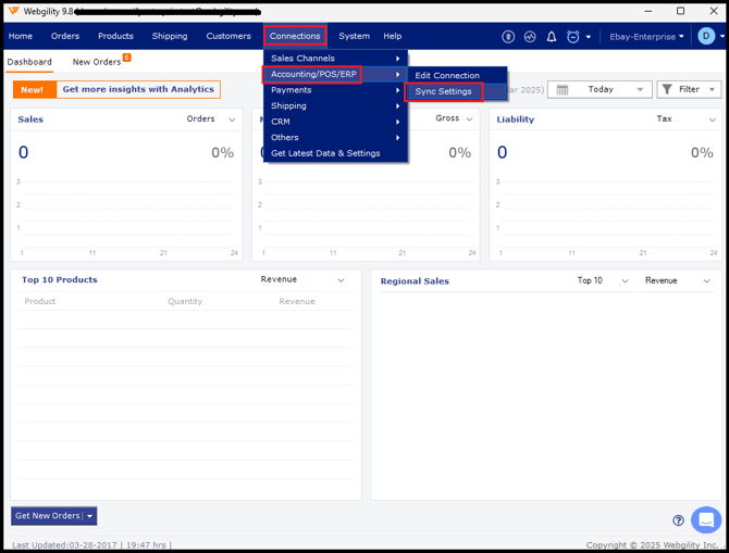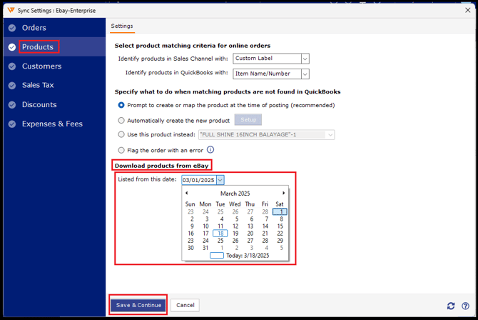 1). To download the products from eBay, you need to set the Products Listed Date under the Webgility Desktop Products settings. So navigate to Connections then goto Accounting/POS/ERP and click on Sync Settings. Now goto Products and under Settings look for "Download products from eBay" and then for List from this date, set a back date, and click Save and Continue.