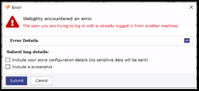 You may get this error, “The user you are trying to log in with is already logged in from another machine†in Webgility Desktop right after launching the application, or during any task, if you use Webgility Desktop on multiple computers.