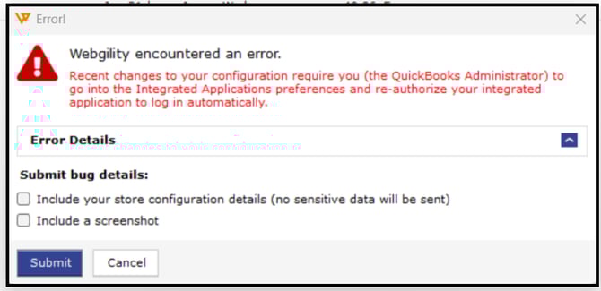 Error: Webgility encountered an error due to recent changes to your configuration. You (The QuickBooks Administrator) are required to go into the integrated applications preferences and re-authorize y
