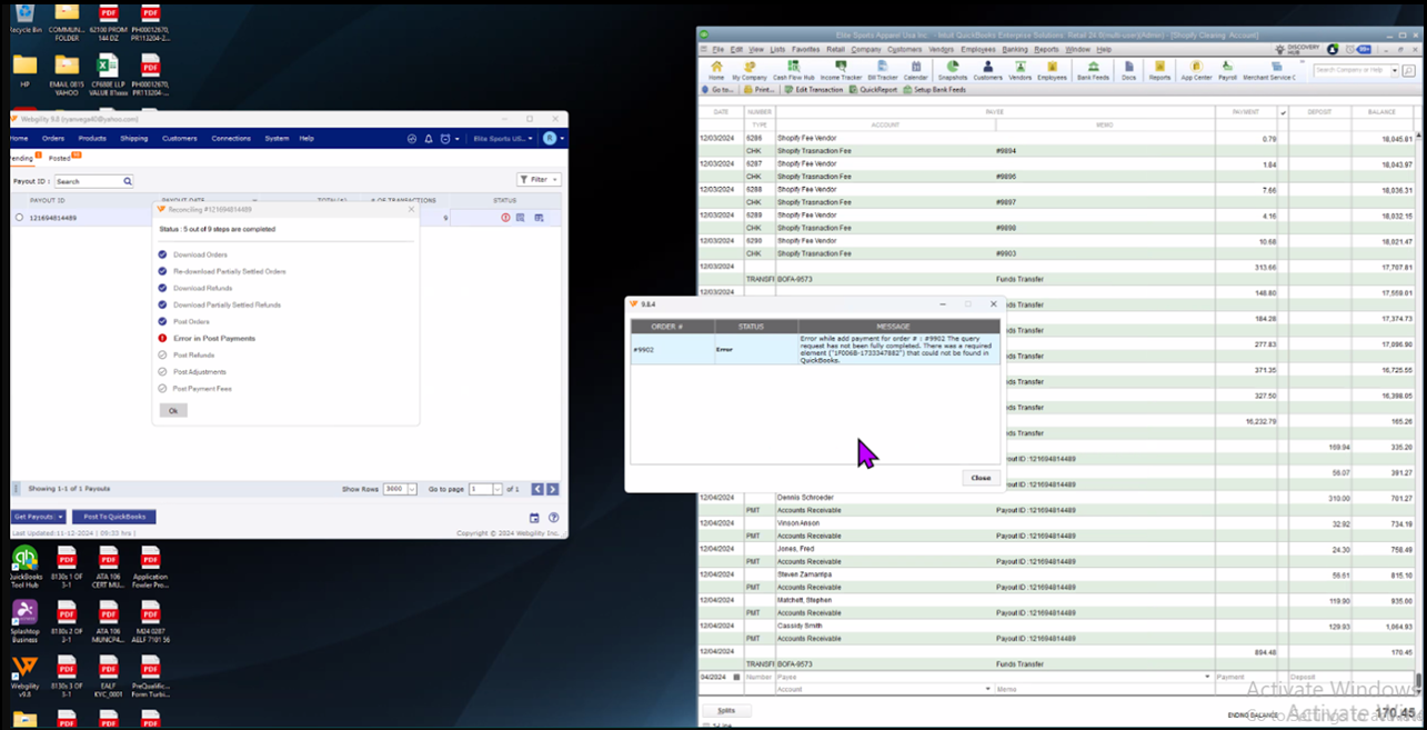 This article explains to Webgility Desktop users, why the payment posting error occurs when processing Shopify payouts through Webgility Desktop and how users can resolve it. The error appears when Webgility Desktop attempts to apply a payment to an invoice in QuickBooks Desktop but is unable to complete the request because required invoice details cannot be found. This situation usually arises when QuickBooks Desktop contains multiple orders sharing the same invoice number, often due to duplicated transaction numbers created within QuickBooks. As a result, Webgility cannot correctly identify the invoice needed for applying the payout. This article guides users through identifying the affected orders, undoing the sync to remove duplicates, and re-downloading and reposting the transactions to ensure the payout processes successfully.