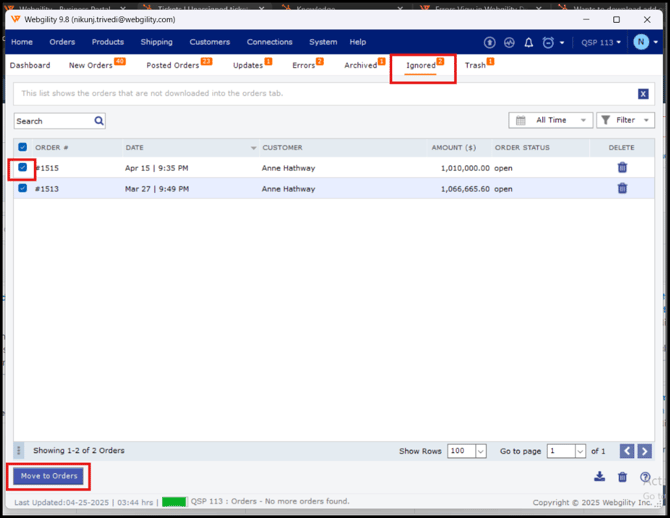 If you’re using Webgility Desktop to post Amazon Settlement Reports, you may encounter the error “Order no. is in ignored status.†This typically occurs when one or more orders linked to the settlement have been moved to the Ignored tab in Webgility Desktop. Since ignored orders are excluded from settlement processing, the posting fails until they are restored. This article explains why this error occurs and provides steps to locate the affected order, move it back to the New Orders tab, and successfully repost the Amazon Settlement Report to QuickBooks Desktop.
