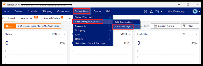In Webgility Desktop navigate to Connections in the menu options, then goto Accounting/POS/ERP and then click on Sync Settings.