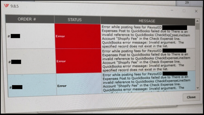 Error while posting fees for payoutID, expenses post to QuickBooks failed due to there is an invalid reference to QuickBooks CheckExpenseLineitemAccount "Shopify Fee" in the Check Expense Line. QuickBooks error message: Invalid Argument. The specified record does not exist in the list