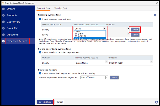 If you have opted to post fees as a line item, then verify and save the active Shopify Fee items from QuickBooks.