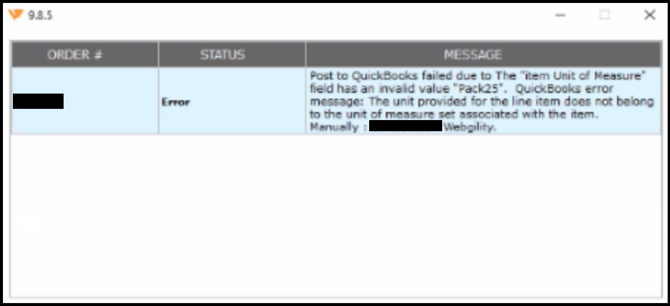 This issue typically arises when posting orders from Webgility Desktop into QuickBooks. This error indicates that a unit of measure assigned on the item is either missing in the Webgility Desktop database or doesn’t match the unit of measure in QuickBooks.