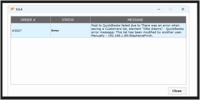 Post to QuickBooks failed due to There was an error when saving a customer's list element. QuickBooks error message: This list has been modified by another user