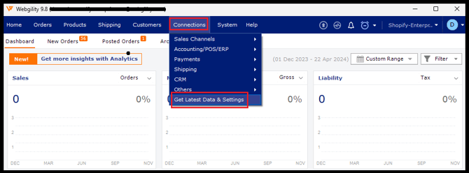 In Webgility Desktop navigate to Connections and then click on “Get Latest Data and Settingsâ€