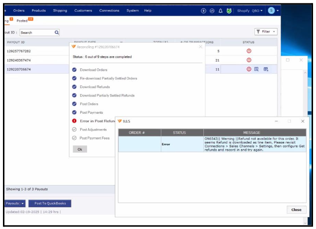 This article helps Webgility Desktop users to resolve the error message “Refund not available for this order. It seems the refund is downloaded as a line item†in Webgility Desktop. This error generally occurs while posting Shopify payouts came with partial refunds from Shopify. This article provides troubleshooting steps to ensure refunds are processed correctly and payouts post smoothly into QuickBooks.
