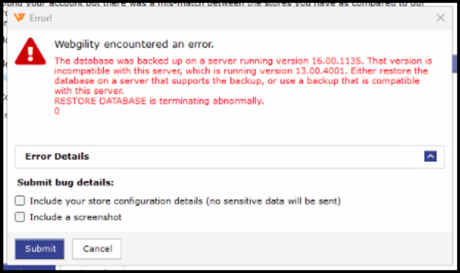 This article helps Webgility Desktop users resolve the error: "The database was backed up on a server running version 16.00.1135. This version is incompatible with the current server, which is running version 13.00.4001." This issue typically occurs when attempting to restore a database backup created in a newer version of SQL Server onto an older version. The guide explains why the error appears and outlines the steps to resolve it, including upgrading your SQL Server instance or recreating the database backup using a compatible version.