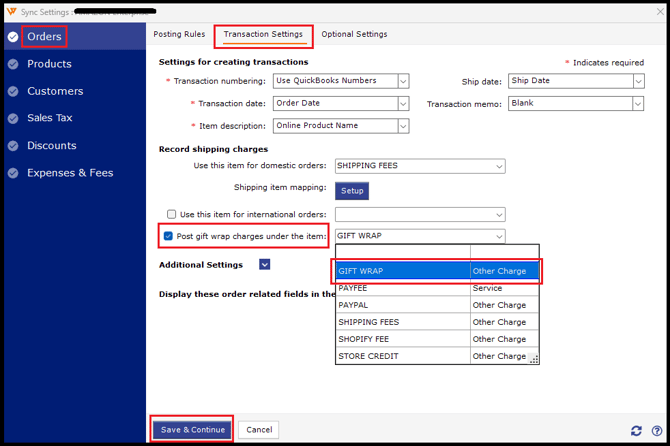 3. Under Orders goto Transaction Settings tab and enable “Post Gift Wrap Charges” and configure an Other Charge type item from Quickbooks Desktop and then Save and Continue.