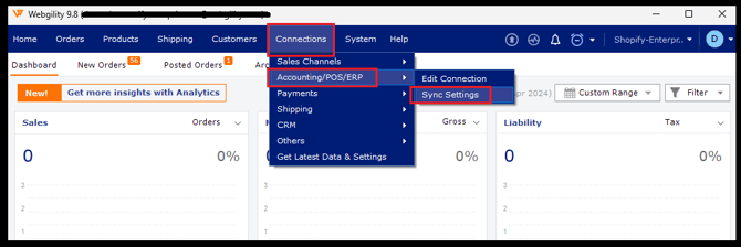 Now in Webgility Desktop navigate to Connections, then goto Accounting/POS/ERP and then click on Sync Settings.