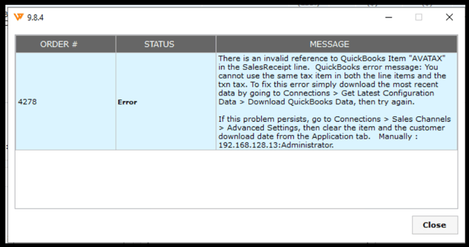This article helps Webgility Desktop users resolve errors "There is an invalid reference to Quickbooks Item "Avatax" in the SalesReciept line. Quickbooks error message: You cannot use the same tax item in both the line items and the txn tax." that may occur when posting orders from Webgility Desktop into QuickBooks Desktop. Such errors often happen if the same sales tax item is configured for both taxable and non-taxable orders in Webgility Desktop. The article explains the cause of the issue and provides step-by-step instructions to correct tax item configurations, ensuring that orders sync successfully between Webgility Desktop and QuickBooks Desktop.