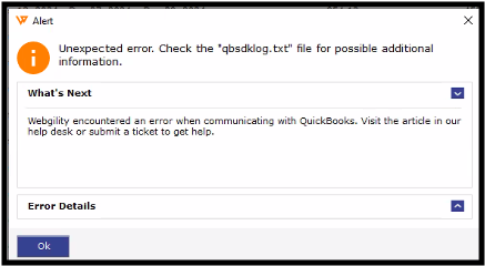 Unexpected error. Check the "qbsdklog.text" file for possible additional information