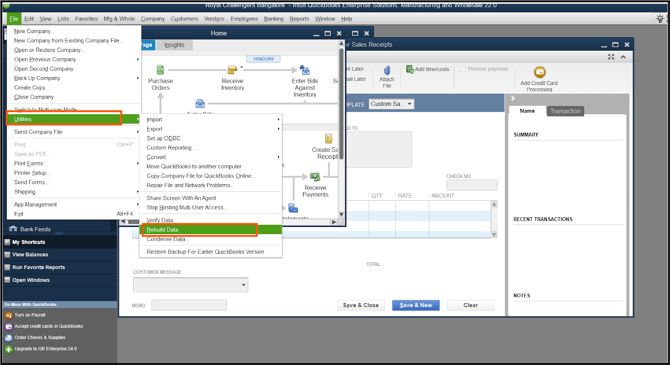 Select Utilities, then choose Rebuild Data from the drop-down menu.