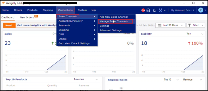 - In Webgility Desktop navigate to Connections → Sales Channel → Manage Sales Channels.