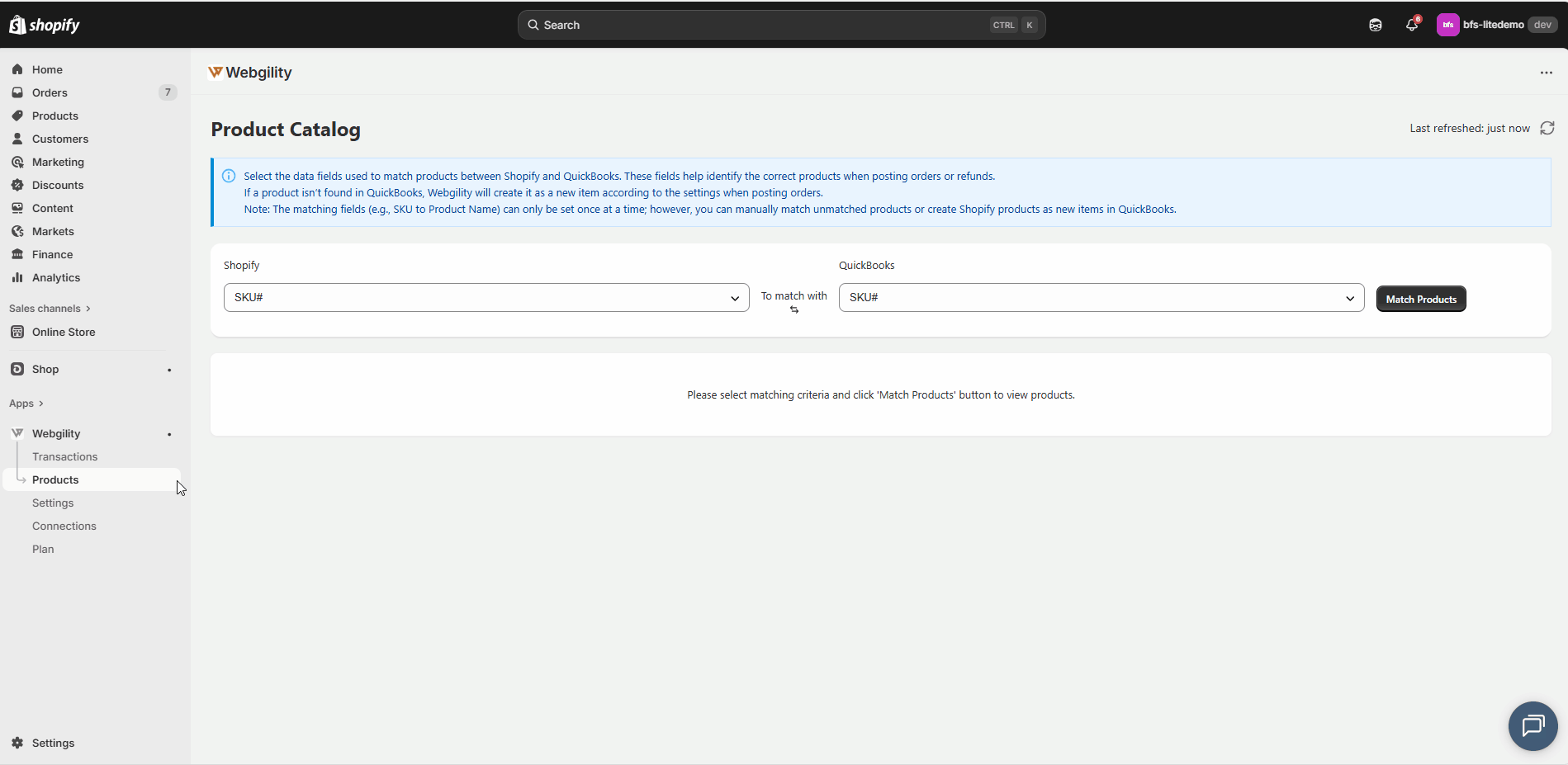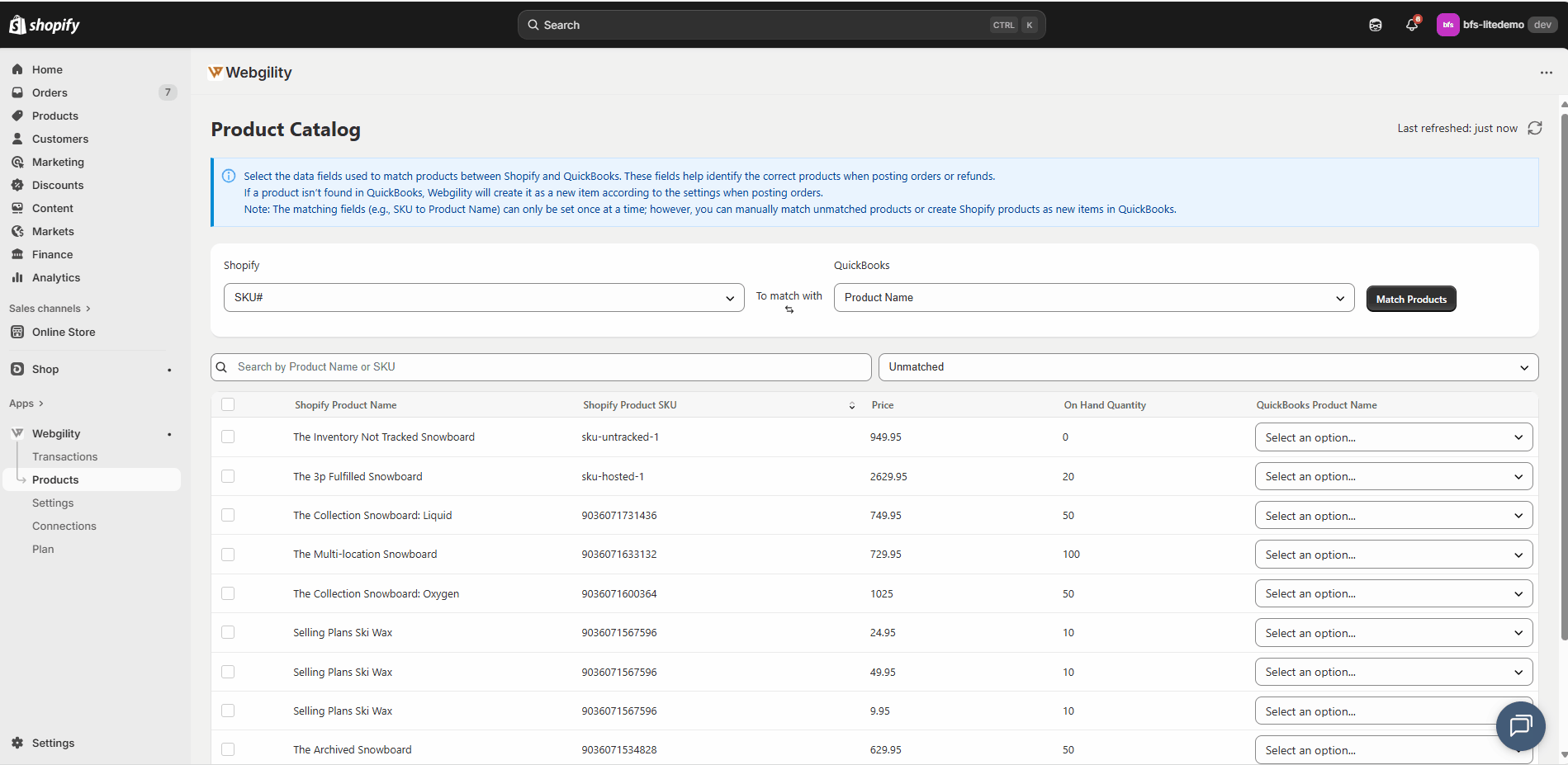 Using the Catalog in Webgility Lite: QuickBooks sync, you can efficiently auto-match, manually match, or create new products to keep your Shopify and QuickBooks Online catalogs in sync. This ensures accurate order postings and smooth inventory management.