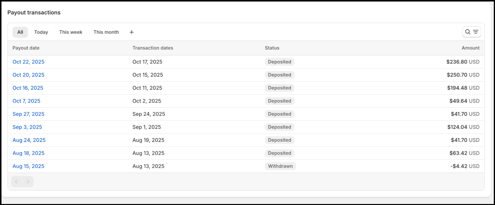 • Check Payout Details (Optional): If you want to see exactly which orders make up that payout, click on the payout itself. This will open a detailed view showing all the individual orders and transactions included.