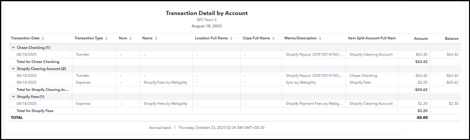 2. Check the Clearing Account Balance: Look under the Assets section for your "Shopify Payments Clearing" account. Now that you've matched the payout, the balance in this account should ideally be $0. If there's a balance, it should only be from new sales that haven't been paid out yet.