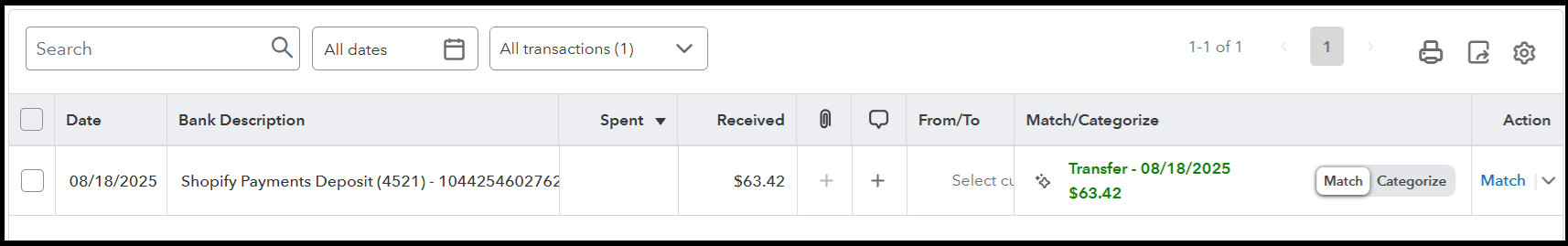2. Find the Shopify Deposit: Locate the deposit from Shopify. Its amount should exactly match the Net payout amount from your Shopify report.