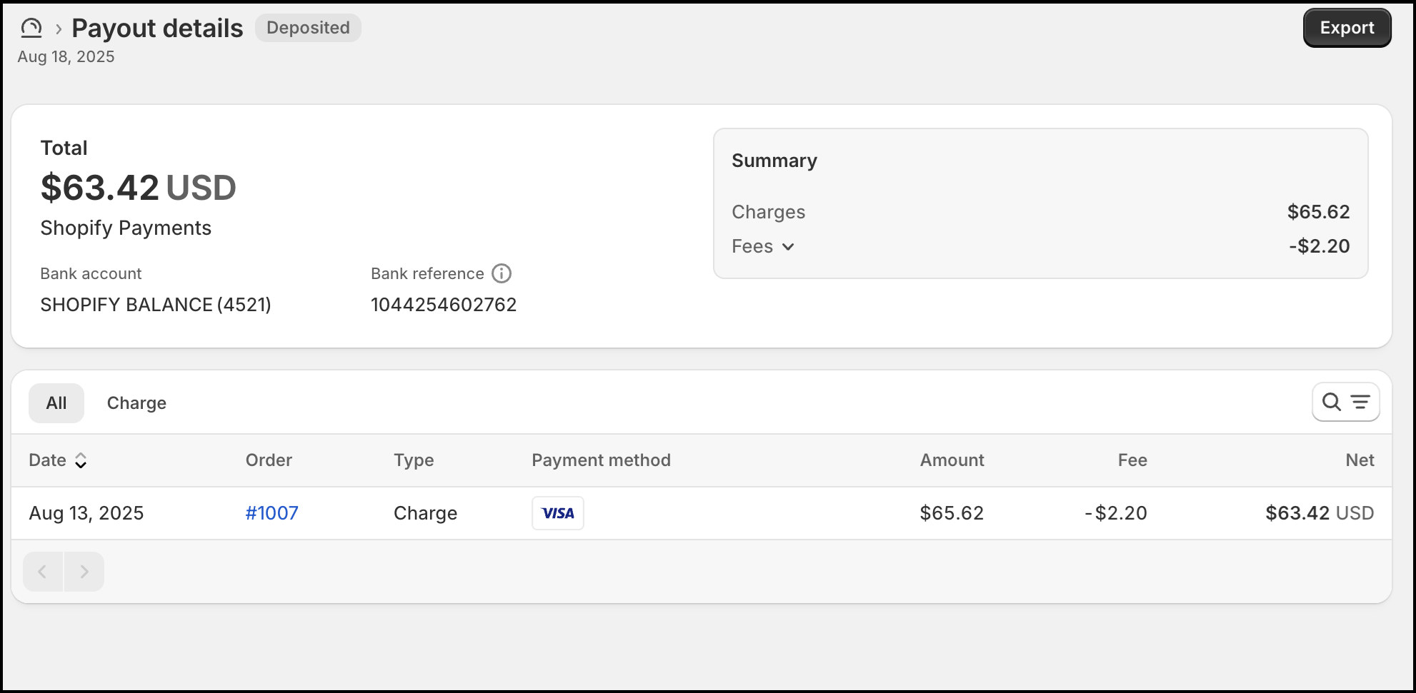 For example, the August 18th payout, which includes orders from August 13th, shows a total collection of $65.62. After deducting $2.20 in Shopify Payment Gateway fees, the net deposit was $63.42.