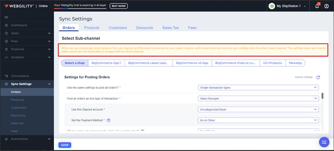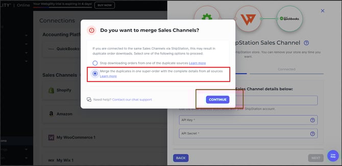 1).So when you connect your ShipStation/ShippingEasy account as a sales channel, if any of these accounts already running any supported sales channel (as sub-channel) which is also connected directly into your Webgility Online so you see these two options. Here you can select, “Merge the duplicates in one super-order with the complete details from all sources”