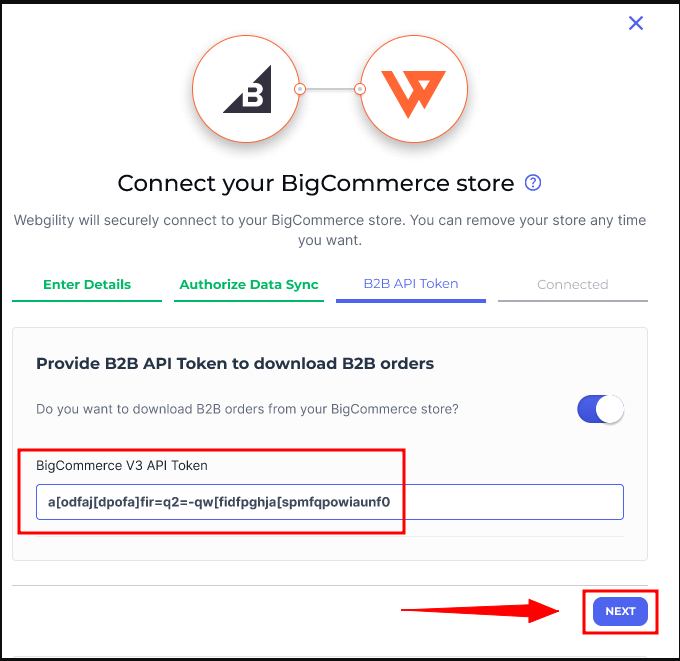 Copy the API token and paste it into the designated field in Webgility Online. Click Next.
