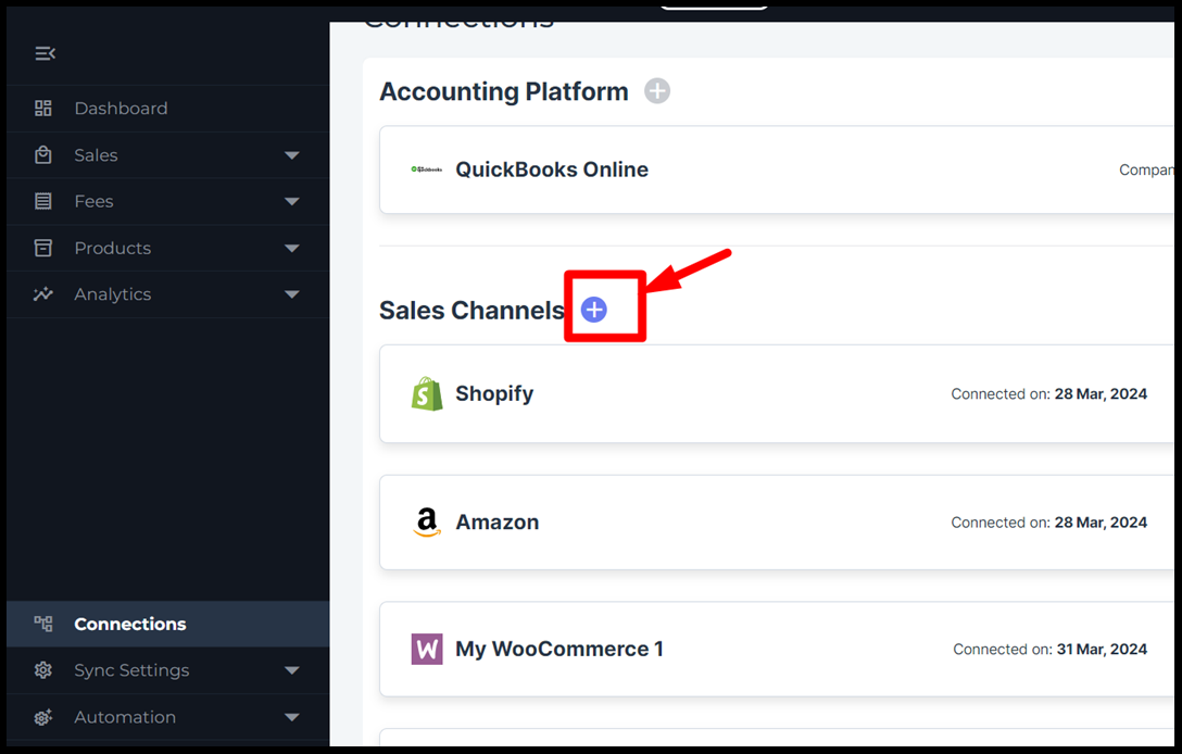 - Navigate to Connections and click the blue plus sign next to Sales Channel.