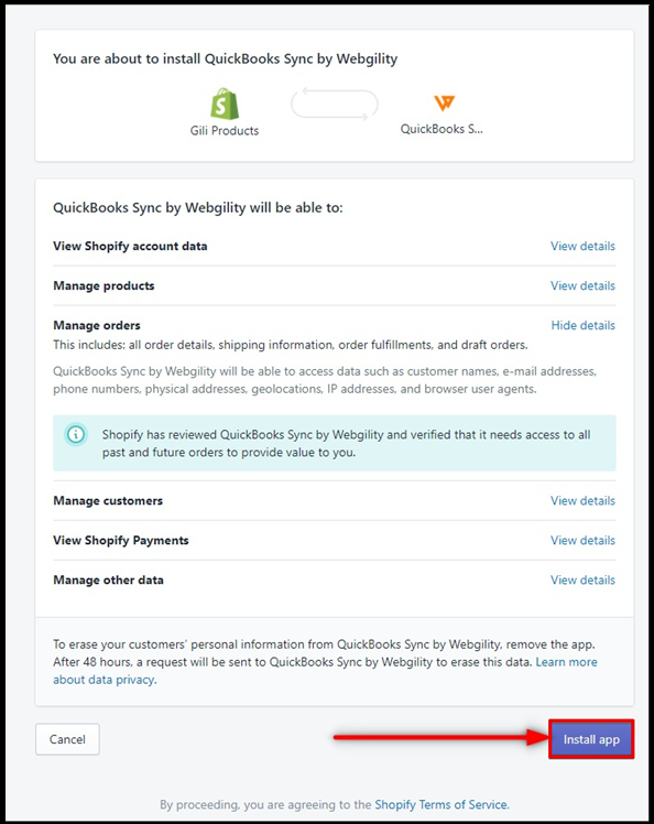 4. A new window from Shopify will open asking to approve and install Webgility. Click the Install app/Update app to continue.