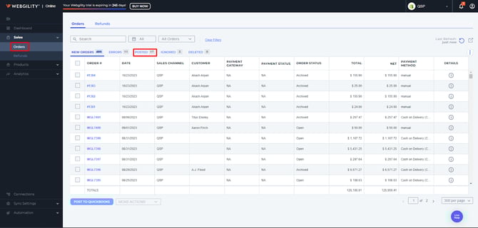 1. After logging in to Webgility Online, go to Sales(On the left panel) and then select Posted Orders from the drop down.