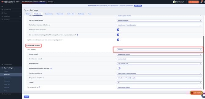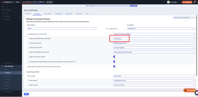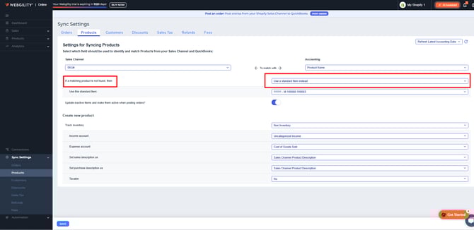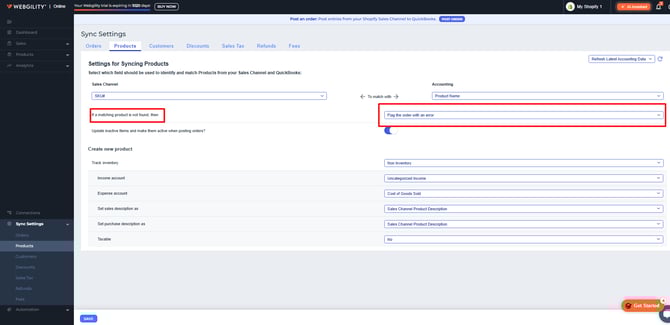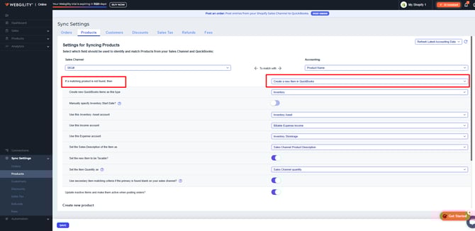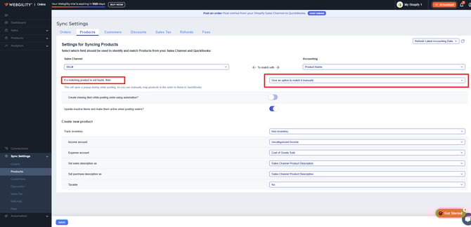 This screen also controls how Webgility Online will respond when a product from your sales channel does not automatically match an item in QuickBooks Online. In the interface, this behavior is highlighted in red for easy identification.