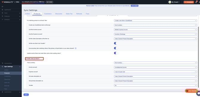 There is another section by the name “Create New Product†at the very bottom, this configuration is used when the user of Webgility Online directly wants to create missing items (Inventory/Non-Inventory) into QuickBooks Online from the Products page instead and does not want to wait for any order posting.