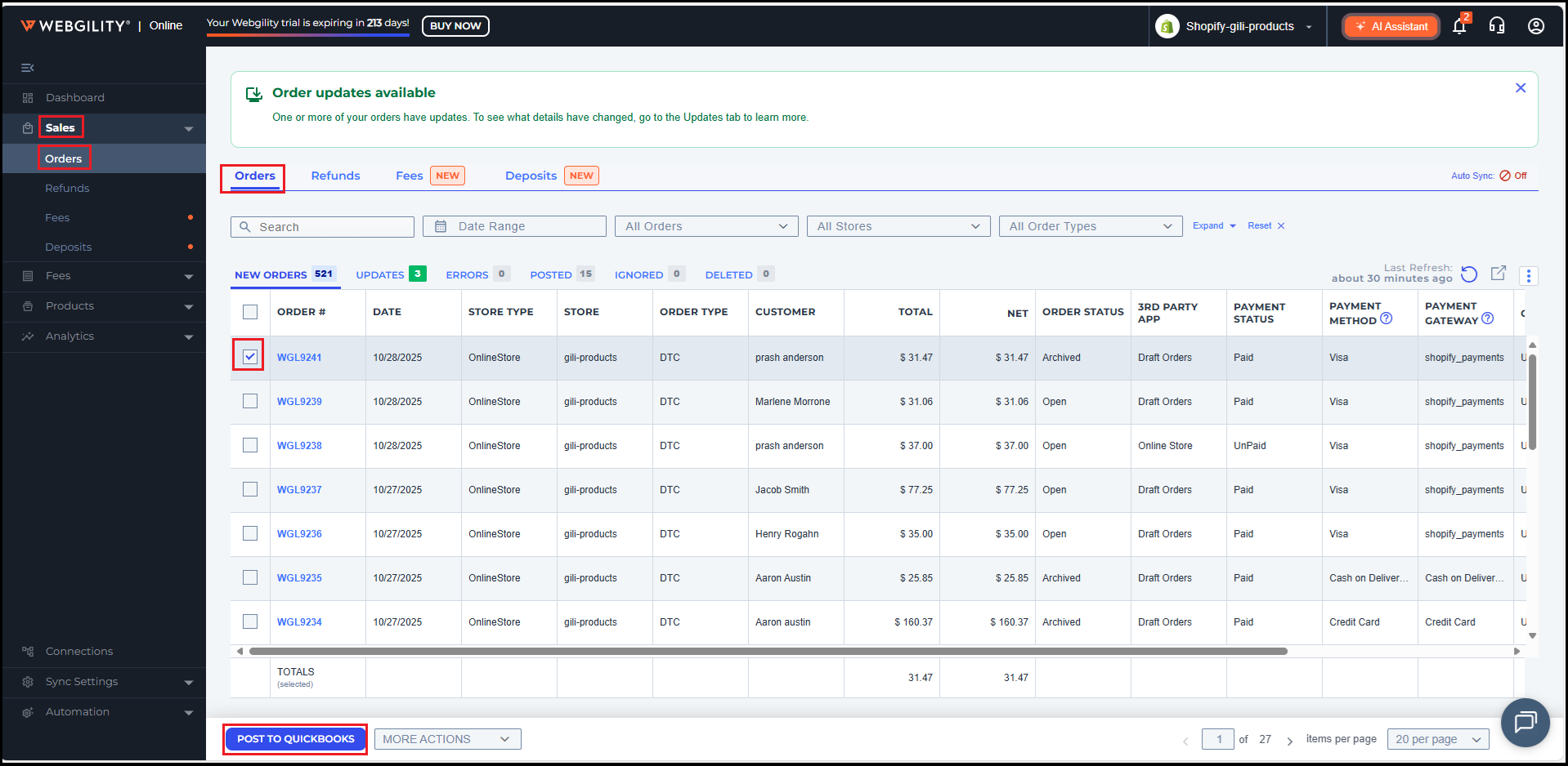 10). Once you are connected to QuickBooks successfully, you can continue to Post an order or click Start Exploring at the top right immediately.If you want to continue to post an order, select Step 3 - Post an order and review. Select one of your orders from the list and click Post Order.