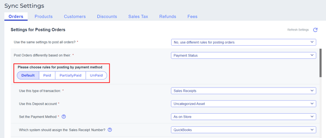 5. Here, you can establish various rules for order posting depending on different payment statuses, allowing you to record orders either as invoices or sales receipts based on the payment status used.