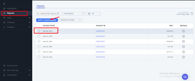 8). Select the Required payouts and click on the ‘Post to QuickBooks’ Button.