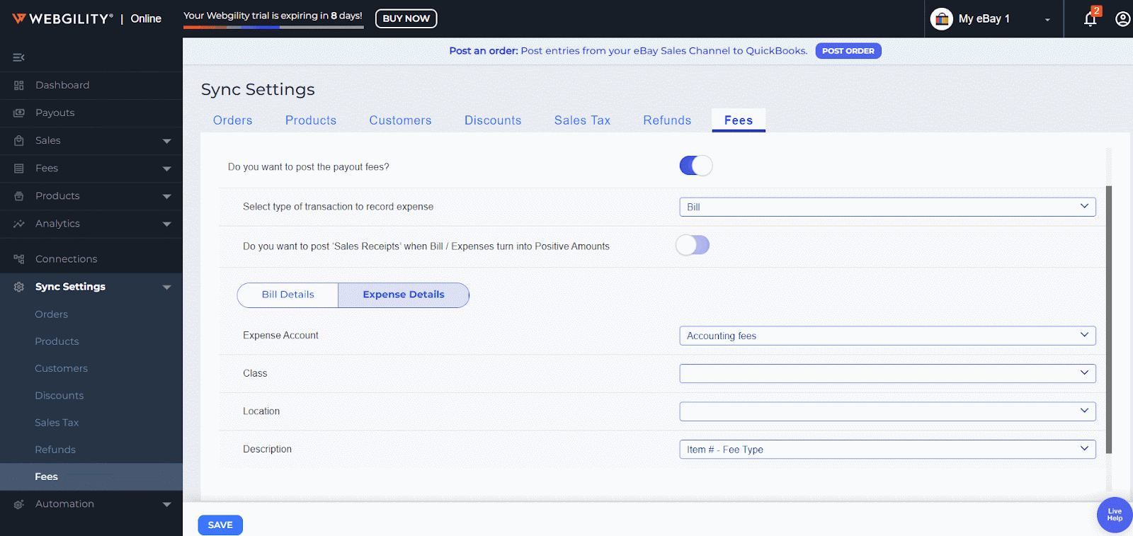 Follow the steps below to configure the Fee posting settings to record eBay Payouts as Bills or Expenses.
