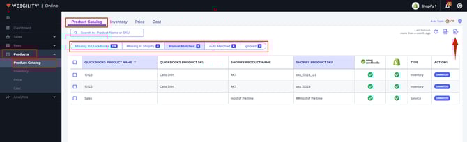 Select the tab of the product list you want to export: Missing in QuickBooks or Manual Matched, etc.