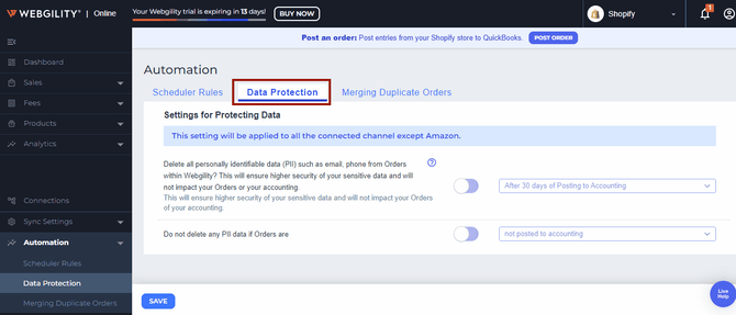 Follow these Steps to configure PII Data deletion in Webgility Online via automation