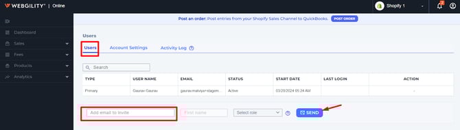 4). Users, If you want to add an add-on user for your Webgility online account, then enter the email address in the email field and click SEND to send the invite to additional users.