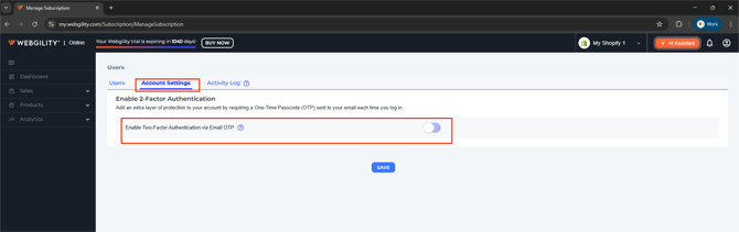 In the  Account Settings  section, enable the toggle button Enable Two-Factor Authentication via Email OTPthe box labeled