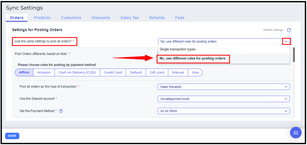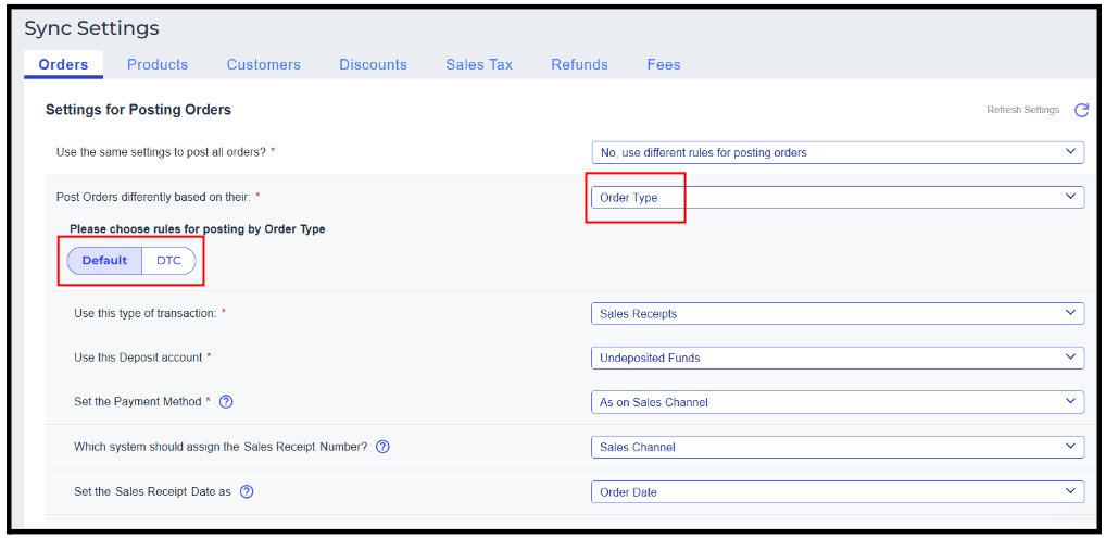 5. Here, you can establish various rules for order posting depending on different Order Type, allowing you to record orders either as invoices or sales receipts.