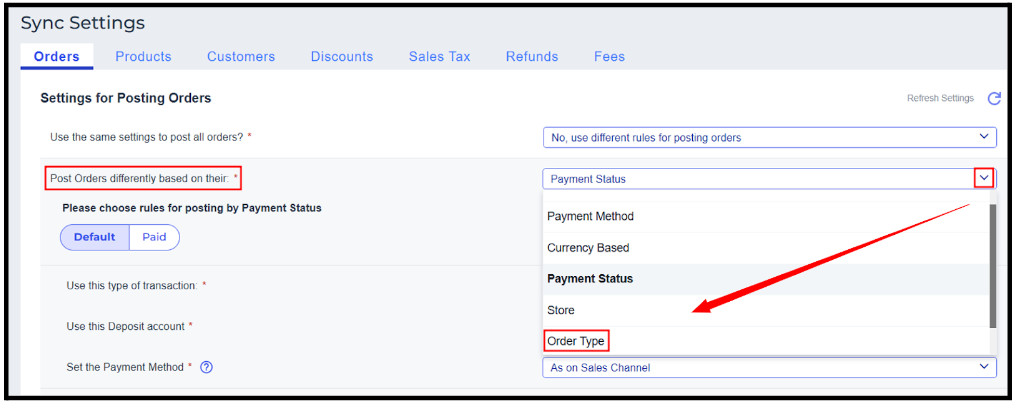 4. Select "Order Type" from the "Post Orders differently based on their" dropdown menu.