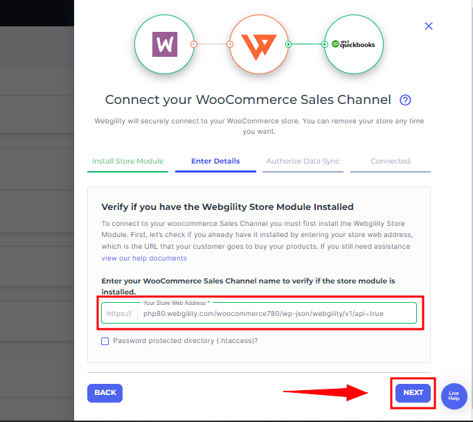 6. Once you've copied the URL of the Webgility Extension, return to the Webgility Online connection process. Begin by inputting the necessary details to integrate WooCommerce with Webgility Online. Paste the Webgility Extension URL and continue with the Next option.
