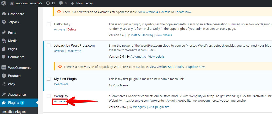 • Navigate to your installed plugins and find the Webgility plugin. Click Activate.