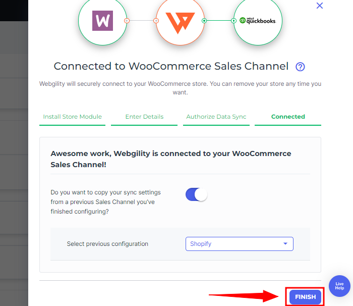 8. Another pop-up will appear, giving you the option to copy your sync settings from another connected sales channel within Webgility Online. If you want to duplicate the existing settings, toggle the button to enable it, then choose the sales channel from the drop-down menu. Otherwise, just select the "Finish" option.