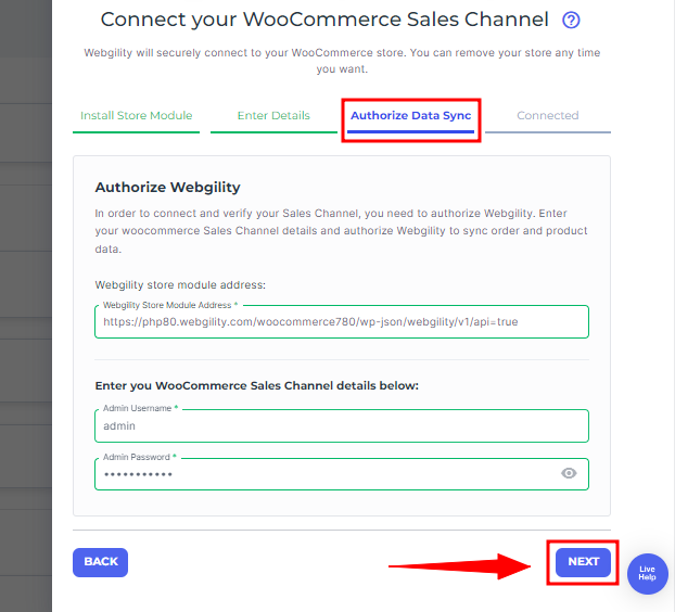 7. Once the Webgility Extension URL is installed and linked, you'll be prompted to the Authorize Data Sync tab provide the admin/primary login credentials of your WooCommerce account, and proceed with the Next option.